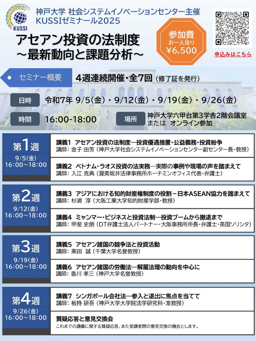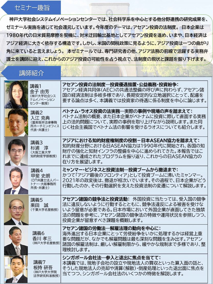 2025年度は『アセアン投資の法制度ー最新動向と課題分析』と題し、ハイブリッド方式で、4週連続7回の講義を提供しました。専門研究者に加え、アジア法務の前線で活躍する実務弁護士を講師に迎え、これからのアジア投資を占う視点で法制度の現状と課題を掘り下げました。戦後一貫して深められてきた日本とアセアンの経済関係は、1980年代からの円高時代に対米迂回輸出基地としての位置づけを強め、今日までに日本経済にとって米国に次ぐ第二の投資収益の源泉として大きく依存しあう関係です。しかし、円安基調・トランプ関税時代の現在、アジア投資は一つの転換期に来ていると言えます。