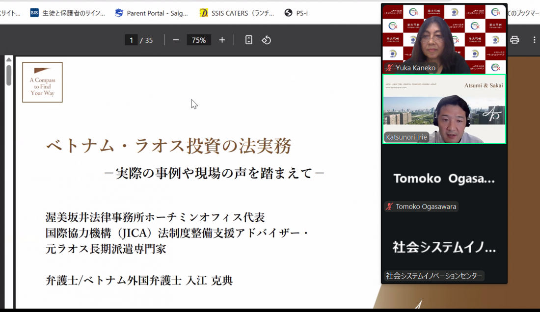 本ゼミナールでは、アセアン経済共同体(AEC)が目標として掲げるグローバル・バリューチェーンに連なる製造業の高付加価値化に仕向けられた、外資法・競争法・知的財産権法・労働法・会社法など主要な経済法制の動きを紹介し、またベトナム・ラオス・ミャンマーなど後発諸国における政策変動・行政運用のリスクに実務現場がどのように向き合っているか、文献では得られない実践的な情報提供がなされ、活発な質疑応答が深められました。